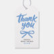 Etiquetas de agradecimento com laço azul empoeirado caprichoso e letras manuscritas divertidas — perfeitas para qualquer festa.