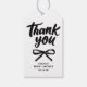 Etiquetas de agradecimento com laço preto caprichoso e letras manuscritas divertidas — perfeitas para qualquer festa.