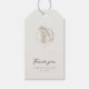 Sofisticada etiqueta de presente de casamento com um design minimalista de galho na frente e um efeito 3D simulado no verso em marfim bege. Personalizada com "Obrigado," os nomes dos noivos e a data do casamento, esta etiqueta elegante adiciona um toque refinado aos presentes ou lembranças, misturando simplicidade natural com estilo contemporâneo.