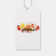 Flores plumeriais de aquarelas brilhantes em vermelhos, laranjas e amarelos com texto Mahalo (obrigado)