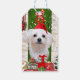 O Natal do Cão Maltês sentado do lado de fora da casa decorada com coroa de Natal, a árvore de Natal é uma ideia perfeita de presente de Natal para amantes de cães.