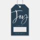 Adicione um toque personalizado aos presentes de feriado adicionando as etiquetas de presentes de feriado do Script Joyful. As etiquetas de presentes de feriado personalizadas contêm a palavra "Joy" em um script branco, moderno, com letra de mão contra um fundo de marinho. Personalize adicionando seu nome ou texto personalizado. A parte traseira apresenta um padrão de pinheiros em marinho e branco.