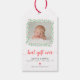 Anuncie a notícia do nascimento de seu recém-nascido com a na moda "Primeiro Natal" com a etiqueta de presente de Natal dobrando como anúncio de nascimento. Apresenta a frase "melhor presente de sempre" em um moderno roteiro escrito à mão em vermelho. A foto do seu bebê é emoldurada pela coroa de água pintada manualmente com bagas vermelhas. Um pequeno detalhe cardíaco vermelho dá a este anúncio um toque especial extra.