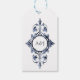 Marca de favor de quadro antigo monograma com um padrão de harlequin azul-marinho cinza no reverso.