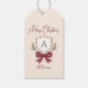 Adicione o toque perfeito de acabamento aos seus presentes com etiquetas personalizadas. Design apresenta "Feliz Natal" em um elegante roteiro manuscrito junto com uma crista festiva e arco de férias. Personalize a etiqueta com um monograma inicial e nome do destinatário. Todas as cores são editáveis. © Kimbellish, LLC