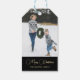 Estas etiquetas clássicas de presentes de Natal apresentam uma foto de cada lado, cor dourada, guião de Natal Merry e o seu nome personalizado num fundo preto elegante. Compre esta loja para coordenar cartões de saudação de Natal e opções de cores de feriado adicionais!