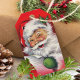 As etiquetas de presentes de Natal apresentam um Papai Noel sorridente, piscando à medida que ele verifica sua lista imprópria ou legal. A parte traseira da etiqueta pode ser personalizada usando a ferramenta de edição de design.