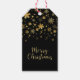 Etiqueta de presente preta com flocos de neve de ouro e as palavras, Feliz Natal. O reverso foi mantido branco, garantindo facilidade de escrevendo para quem o presente é e de quem ele é.