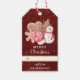 Etiqueta de presente festiva personalizada com biscoitos de férias pintados à mão, pintados à água, frase "Feliz Natal" em caligrafia escrita à mão e tipografia de blocos, área para que você possa adicionar mais tarde o proprietário do nome do presente, e duas seções de texto na parte inferior com sua própria mensagem e nome, sobre um belo fundo vermelho e falho dourado. De volta com o mesmo fundo vermelho e dourado e biscoitos de férias da frente e a frase "Felizes Feriados". Várias etiquetas de presentes, placas de papel, guardanapos, aventais e convites de festas de Natal também estão disponíveis.