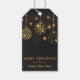Esta dramática etiqueta de presente de Natal é tão bonito quanto única. O preto e o ouro são sempre elegantes e aqui não há exceção. Os ornamentos Dourados têm uma poeira de minúsculos confetes dourados e luzes de estrelas douradas sobre fundo preto. Na parte inferior está o texto dourado que diz "MERRY CHRISTMAS & Feliz ano novo". A parte traseira da etiqueta tem o mesmo design de ornamento, mas a parte inferior corresponde a ouro leve para facilitar a gravação de nomes.