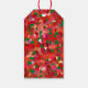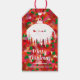 Um Enfeites de natal branco com uma silhueta de Papais noeis e sua trincheira, árvores verdes, as palavras Feliz Natal e seu nome familiar em letra chic são apresentadas em um padrão de cor abstrato de feriado nestas etiquetas de presente ou favor.