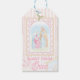 This Christmas gift tag features pastel nativity scenes of baby Jesus sleeping in a manger with Mary and Joseph, three wise men and angels. There is a light pink striped background.