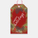 Etiqueta de presente clássico de Natal contemporâneo com citação de texto de Feriados Felizes, em letra de tipografia branca elegante e minimalista, em cima do pínecones, sobre fundo vermelho escuro. Com opção para personalizar com o nome da família ou da empresa ou texto curto de sua escolha.