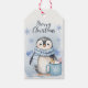 Uma ilustração encantadora de inverno de um adorável pinguim vestindo um chapéu e cachecol listrados, trazendo uma vibração acolhedora e festiva. Os flocos de neve suaves e tons azuis suaves no fundo criam uma atmosfera mágica de inverno. Perfeito para cartões de Natal, posters, adesivos e artesanatos sazonais!