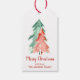 Entregue seus presentes de Natal com este simples design moderno mínimo apresentando um abstrato de aquarela de dois pinheiros em vermelho-mudo e verde. Feliz Natal está escrito embaixo de um roteiro vermelho e retrô correspondente. Você pode personalizar facilmente com seu nome. Um padrão do pinheiro vermelho está no verso da etiqueta.