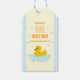Um pato sortudo! Primeiro aniversário com pato de borracha e bolhas contra gingham azul claro e fundo amarelo pálido com texto laranja