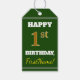 Este design de etiqueta de presente de aniversário apresenta uma mensagem como "primeiro aniversario FELIZ, Nome Próprio!", onde o nome pode ser personalizado, e onde o número "1rua" tem uma aparência de cor falsa/imitada. A frente também apresenta um fundo de cor verde. A parte traseira apresenta uma linha "De:". As etiquetas de presentes de aniversário como estas poderiam talvez ser usadas em presentes que são dados para o primeiro aniversário de alguém. [~Z0000210]