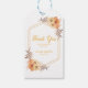 Um obrigado de aniversário elegante e elegante, você tem uma etiqueta de presente com uma flor de laranja e folhas marrons, com uma tipografia de ouro moderna, em um fundo branco.