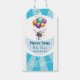 Uma deliciosa etiqueta de presente azul e chá de fraldas branco com um balão, maravilhosamente projetada para segurar doces surpresas para os convidados celebrando a nova chegada.