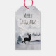 Uma etiqueta de presente de Natal feliz com uma imagem de aquarela apresentando uma rena de silhueta preta em pé entre alguns pinheiros. Esquema de cor neutra a preto e branco.