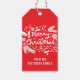 Red Felry Natal Festivo Foliday Floral Name Gift Tags são perfeitos para a sua festa de Natal com o texto "Feliz Natal" em roteiros brancos modernos rodeados por flores de inverno. Personalizado com seu nome, editando o texto na caixa de texto fornecida. Projetado por feriados do Evco www.zazzle.com/store/evcoholidays