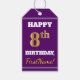 Este design de etiqueta de presente de aniversário apresenta uma mensagem como "HAPPY 8th BIRTHDAY, FirstName!", onde o nome pode ser personalizado, e onde o número "8º" tem uma aparência de cor falsa/imitada. A frente também apresenta um fundo de cor púrpura. A parte traseira apresenta uma linha "De:". As etiquetas de presentes de aniversário como estas poderiam talvez ser usadas em presentes que são dados para o oitavo aniversário de alguém. [~Z0000212]