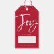 Adicione um toque personalizado aos presentes de feriado adicionando as etiquetas de presentes de feriado do Script Joyful. As etiquetas de presentes de feriado personalizadas contêm a palavra "Joy" em um script branco, moderno, com letra de mão, contra um fundo vermelho profundo. Personalize adicionando seu nome ou texto personalizado. A parte traseira apresenta um padrão de pinheiros em vermelho e branco.