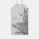 A simple and elegant Christmas gift tag featuring a snow-covered pine branch against a soft winter sky.