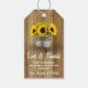 Sunflower Mason Burlap e Lace Wedding Obrigado Tags - apresentam um fundo de madeira rústica na frente e atrás com jarras de pedreiro cheias de girassóis na frente. Os potes de Mason são decorados com burlap, lace e twine. Consulte a coleção de correspondência de cheios neste design.