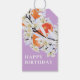 Uma etiqueta de presente de aniversário Elegante e Chic Happy com lindas ramificações tangerinas florescentes. Cartão botânico floral com flores e citrinos primavera delicados. Cor laranja, pastel e lilás. Adicione seu texto.
