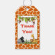 Um obrigado com uma etiqueta de presente com um tema de safari legal. O fundo é um padrão de pele de girafa. Projetado com uma faixa de folhas da selva no topo e macacos maliciosos pendurados de cabeça para baixo. Um hipopótamo, gorila, leão e girafa pendurados no fundo em algumas gramíneas de savana.