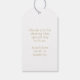 Este bonito casamento Obrigado, a etiqueta de presente apresenta uma bela fita azul-aquática, empoeirada, ao lado de uma fonte contemporânea, com uma cor de ouro de falso chic e de tendência, contra um fundo branco nítido, tanto frente como verso. O verso inclui texto opcional para uma mensagem especial.