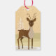 Etiquetas de presentes de Natal. Etiqueta de presente personalizada com um veado parado na neve ao lado de árvores decoradas com ornamentos vermelhos, e texto personalizado para personalizá-lo.