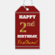 Este design de etiqueta de presente de aniversário apresenta uma mensagem como "segundo aniversário FELIZ, Nome Próprio!", onde o nome pode ser personalizado, e onde o número "segundo" tem uma aparência de cor falsa/imitação em ouro. A frente também apresenta um fundo vermelho. A parte traseira apresenta uma linha "De:". As etiquetas de presentes de aniversário como estas poderiam talvez ser usadas em presentes que são dados para o segundo aniversário de alguém. [~Z0000207]