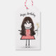 Menina bonitinha com buquê margarida, tênis, vestido de gingham, cabelo e colar de pérolas, em um fundo branco para o aniversário. O lado inverso é um padrão de gingham desbotado vermelho e branco. O texto pode ser alterado.