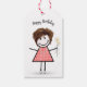 Menina bonitinha com buquê margarida, tênis, vestido de gingham, cabelo e colar de pérolas, em um fundo branco para o aniversário. O lado inverso é um padrão de gingham desbotado vermelho e branco. O texto pode ser alterado.