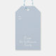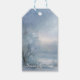 The tag's background features muted blue and silver tones, accented with hints of subtle lavender and peach in the sky, reflecting an early morning or late afternoon glow. Elegant script proclaims 'Season's Greetings,' adding a classic touch, but you can personalized the front and back. Ready to tie onto your special gifts, holiday party favors, or Christmas gift wrapping.