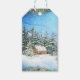 Adicione uma terra natalícia pacífica aos seus presentes com estas etiquetas festivas de aquarela. Uma cabana coberta de neve é enfiada na floresta entre as árvores, com vegetação de férias fritando o topo e o fundo.