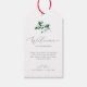 Estas etiquetas de presentes de boas-vindas em áreas verdes são perfeitas para um verão ou casamento outono. A design do boho moderno apresenta folhas de esmeralda, sábio e aquarela verde-oliva e botânicos com esférulas de flores brancas elegantes. Personalize as etiquetas com a localização do seu casamento, uma pequena nota de boas-vindas, os seus nomes e a data do casamento. Essas etiquetas são perfeitas para casamentos de destino e bolsas de boas-vindas de hóspedes.