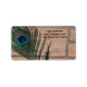 Impressionante fotografia de uma pena de pavão com tijolos de arenito de fundo. A vida tranquila das coloridas penas de pavão é magnífica. Essas etiquetas de endereço divertidas podem ser usadas como presente ou excelente para os convites de casamento correspondentes.
