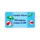 Uma etiqueta de endereço personalizada com letras personalizadas azuis e arte divertida de tema de praia ou piscina de uma bola de praia vermelha, guarda-sol verde em um fundo azul aquático com ondas onduladas. Personalize para alterar fontes, elementos, tamanho da etiqueta e muito mais, até salve seu design para mais tarde.