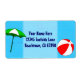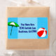 Uma etiqueta personalizada com letras azuis e arte divertida com tema de praia ou piscina de uma bola de praia vermelha, guarda-sol verde em um fundo azul aquático com ondas onduladas. Personalize para alterar fontes, elementos, tamanho da etiqueta e mais, até salve seu design para mais tarde.