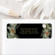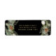 Essas maravilhosas etiquetas de endereço de volta de feriado apresentam uma borda da coroa de Natal com uma elegante folhagem botânica verde, e cones de pinheiro com flores brancas festivas e texto dourado em fundo preto escuro.