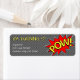 Enviem incríveis convites para a festa de super-heróis com rótulos de endereços de retorno de super-heróis. Este design apresenta uma bolha de efeito de som "POW!" de um quadrinho super-herói com a aparência familiar de uma bolha vermelha pontilhada com sombras pontilhadas pretas. "POW!" está em um preenchimento amarelo pontilhado de duas tonalidades com uma ligeira sombra preta para fazer a palavra pop.