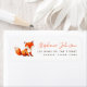 À esquerda, há uma raposa vermelha fofa pintada em aquarela. À direita, o nome está escrito em um roteiro de letra cursiva vermelha, o endereço em letras minúsculas maiúsculas.