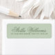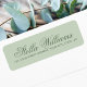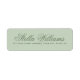 Etiquetas de endereço de retorno elegantes com seu nome em uma fonte elegante de script de caligrafia e o endereço abaixo em um plano de fundo verde leve.