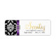 Rótulo 2 do Damasco Preto Roxo. Este elegante design usa efeitos digitais para IMPRESSÃO a aparência de uma fita de cetim roxa e broche de diamante e um texto de folha de ouro com efeito 3D em uma etiqueta adesiva de papel tapete da Avery. Elke Clarke ©2012 Para diferentes letras ou iniciais, diferentes fitas coloridas ou cores damasco, contacte luxuryweddinginvitations@gmail.com.