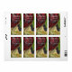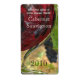 Um rótulo para vinicultores caseiros, com uma fotografia de um monte de uva vermelha púrpura numa vinha com folhas verdes sobrepostas com uma ilustração fundida de um copo de vinho tinto.