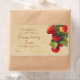 Ilustração de morangos com folhas verdes, sobre fundo bege com texto colorido russet, feita de pintura de safra. O rótulo é criado para enlatar ou engarrafar casas de doces, geleias e conservas. Você pode deixar o espaço de data para escrever ou mudar para a data em que seu emperramento ou gelatina foi feito.