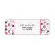 Etiqueta de endereço com um design de costura, constituído por uma máquina de costura, colheres de rosca, uma almofada de pinos, tesouras, tecidos e agulhas de costura. Design tem um esquema de cor rosa.